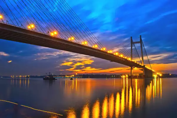 thousands of vehicles and pedestrians daily. The bridge stretches over the Hooghly River, offering