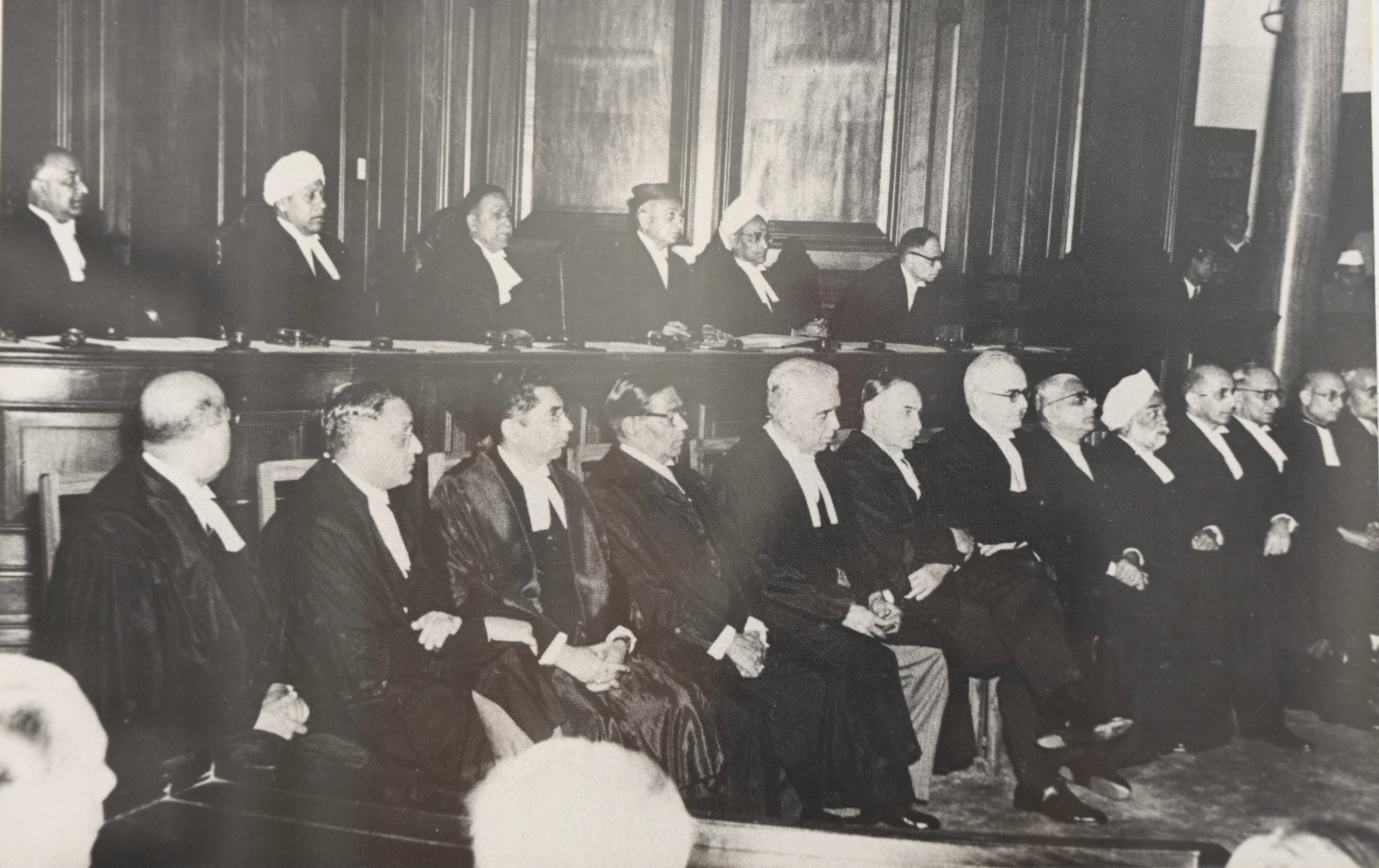 The first Chief Justice of India, Hon'ble Justice Harilal J. Kania with other Judges of the Supreme Court on the dais and the Chief Justices of all High Courts on the inaugural sitting of the Supreme Court on 28 January 1950.