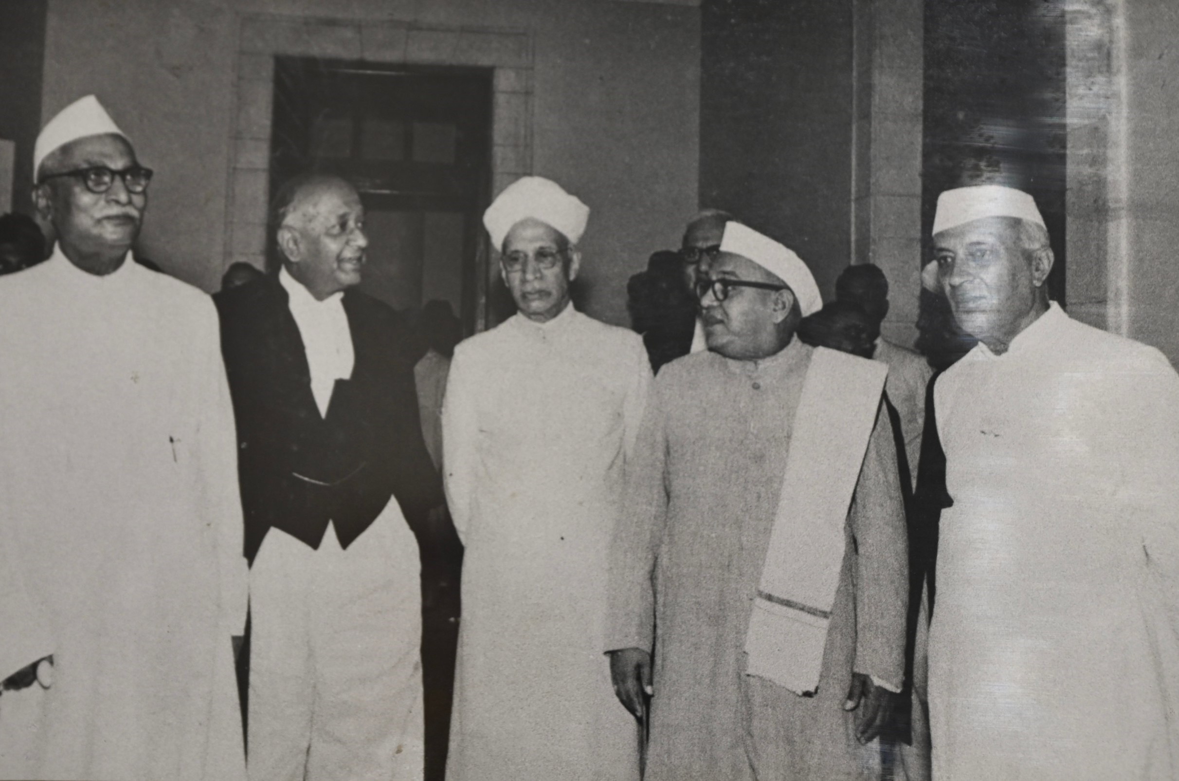 (From the left) Dr. Rajendra Prasad, President of India, Shri S.R. Das, Chief Justice of India, Dr. S. Radhakrishnan, Vice-President of India, Shri Ananthasayanam Ayyangar, Speaker, Lok Sabha and Shri Jawaharlal Nehru, Prime Minister of India on the occasion of inauguration of the Supreme Court building on 4 August 1958..