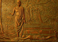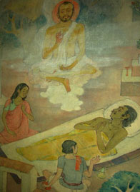 They narrated the last days of Rasik: The sanctified water of the Radhakanta temple seemed to have a stimulating effect on Rasik. He felt better. His fever abated and he spent his waking hours in chanting the Lord's name and in fervent prayer. One day when they returned home after their work at about midday, he insisted on their taking meal at once. After they had complied to his wish, he asked them to take him out to the tulsi grove. It was hot outside. They reluctantly obeyed him. He lay on a mat with his rosary in his hand and asked them to chant God’s name. After half an hour his face brightened up. There was an ardent look in his eyes and a smile on his lips. He exclaimed: “Oh, Thou hast come at long last! How unsurpassingly beautiful, glorious resplendent!” He then closed his eyes and it seemed to them that a halo played around his radiant peaceful face as he fell into eternal sleep.