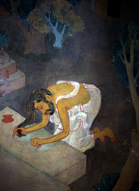 One day a golden opportunity came. The Master went to the pine grove to answer the call of nature and brother Ramlal was waiting near the Panchavati. Rasik hid himself behind a tree and thought, “I don't care what will happen; I can't bear it anymore.” When the Master was returning, Rasik prostrated himself on the path near the Nahabat (the music tower of the temple), grabbed his feet, and cried out: “Father, what will happen to me?”