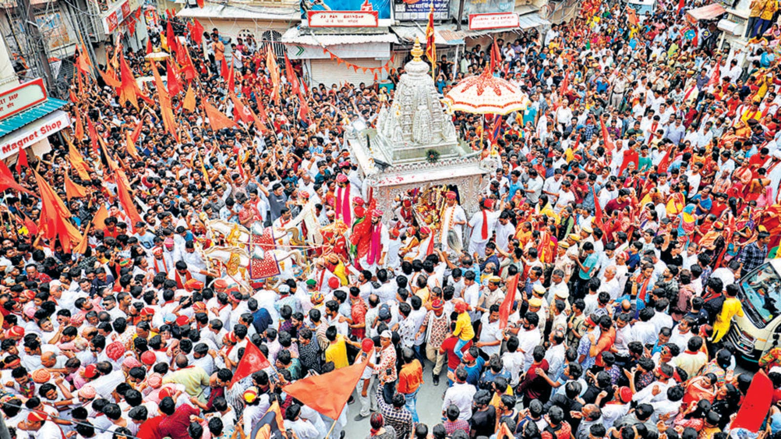 | Ratha Yatra is a Hindu festival that celebrates the journey of three deities, Jagannath, Balabhadra, and Subhadra. The festival is held annually in the city of Puri, India, on the bright half of the lunar month of Ashadh.The festival commemorates the deities' journey from their home temple to their aunt's temple, about three kilometers away. The deities' statues are carried through the streets in a chariot, and each chariot has its own name. Lord Jagannath's chariot is called Nandighosh, and the chariots of Lord Balabhadra and Devi Subhadra are called Taladhwaja and Darpadalana, respectively.The festival is believed to have begun when Subhadra, the sister of Lord Jagannath, expressed her desire to visit Puri. The festival highlights the cultural heritage of Odisha and is considered the oldest and largest Hindu chariot festival.Lakh of devotees have thronged to Odisha's Puri for a glimpse of Lord Jagannath whose idol is taken out from the Jagannath temple on the occasion of Jagannath Puri Rath Yatra set to begin on Tuesday.The holy festival is organised according to the Hindu calendar and takes place every year on the second day of the bright fortnight in the month of Ashadha. The festival is celebrated with huge joy and fervour across the coastal city of Odisha. Know more about the Jagannath Puri Ratha to understand the centuries-old ritual and its significance.On this day, Lord Jagannath, which also means ‘Lord of the Universe’, is taken out of the temple on beautiful chariots. Along with the idol of Lord Jagannath, idols of Lord Balabhadra and Goddess Subhadra are also taken out on different chariots and given a tour of the whole city before being taken to the Gundicha Temple. |