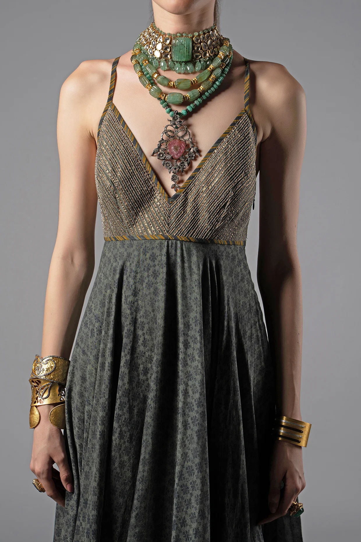 The philosophy of JJ Valaya is to create for today, not for tomorrow. JJ Valaya has been hugely motivated by history and wants to make it relevant today. Customers have access to the finest in the world today. JJ Valaya offers a mix of royalty and elegance. JJ Valaya's pieces showcase appreciation of history and find great magic in exploring the mysteries of various cultures to create something new. JJ Valaya believes Indian fashion houses must take the responsibility to nurture crafts and artisans. The designer is fascinated by beads, metals, buttons, gemstones, and sequins. As per the designer, embroidery is a medium that lends itself to anything that the mind can perceive. The use of metal embroidery is common in the designer's work. The presence of materials like dabka, kora, and mukaish is spotted in his designs in a contemporary way. JJ Valaya believes in experimenting with the medium without compromising on the purity of the technique.