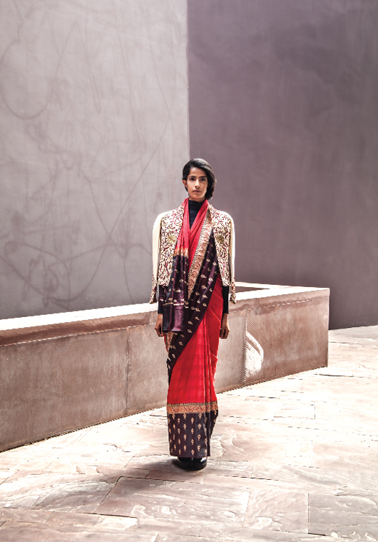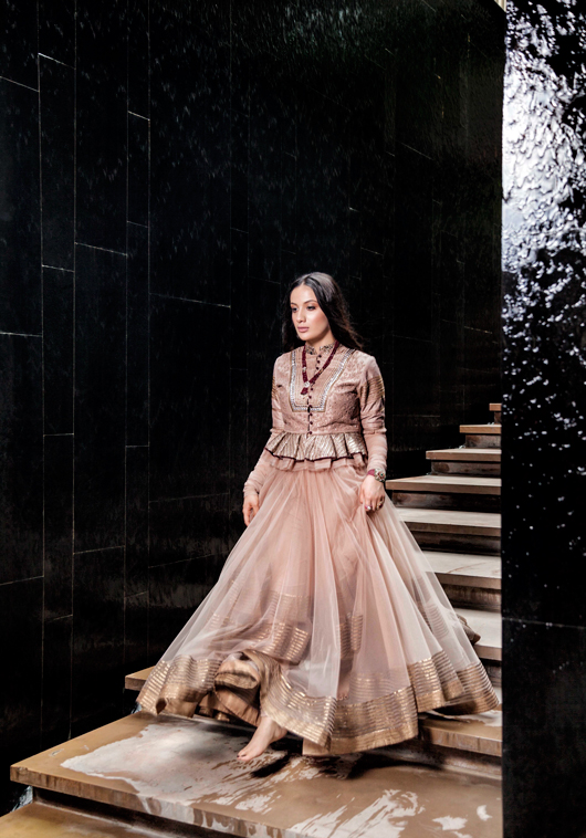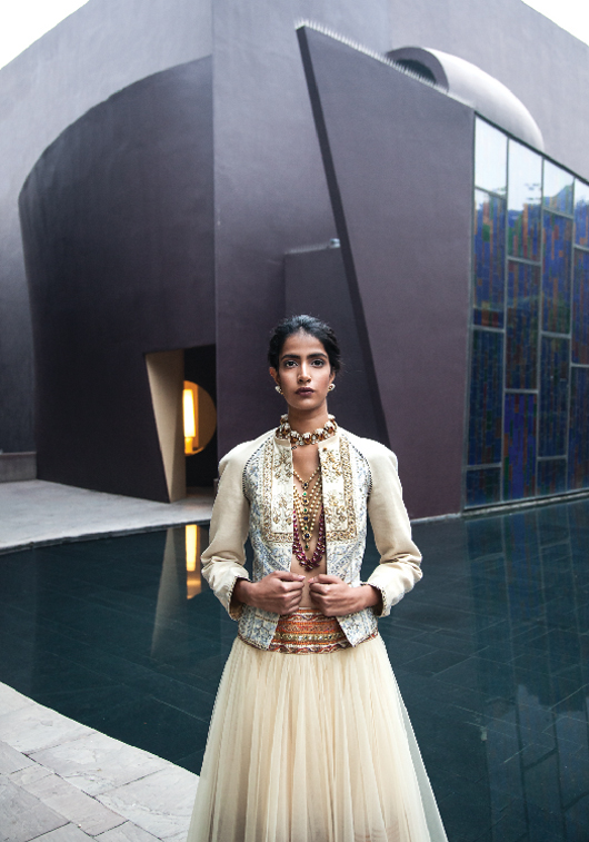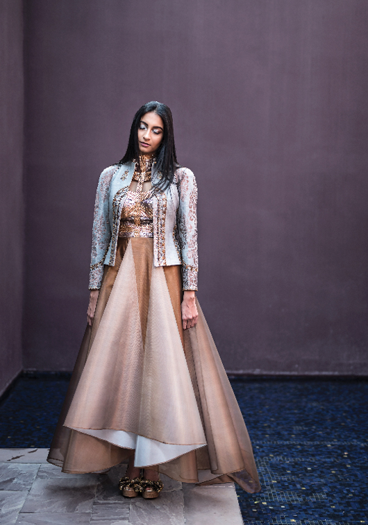 The philosophy of JJ Valaya is to create for today, not for tomorrow. JJ Valaya has been hugely motivated by history and wants to make it relevant today. Customers have access to the finest in the world today. JJ Valaya offers a mix of royalty and elegance. JJ Valaya's pieces showcase appreciation of history and find great magic in exploring the mysteries of various cultures to create something new. JJ Valaya believes Indian fashion houses must take the responsibility to nurture crafts and artisans. The designer is fascinated by beads, metals, buttons, gemstones, and sequins. As per the designer, embroidery is a medium that lends itself to anything that the mind can perceive. The use of metal embroidery is common in the designer's work. The presence of materials like dabka, kora, and mukaish is spotted in his designs in a contemporary way. JJ Valaya believes in experimenting with the medium without compromising on the purity of the technique.