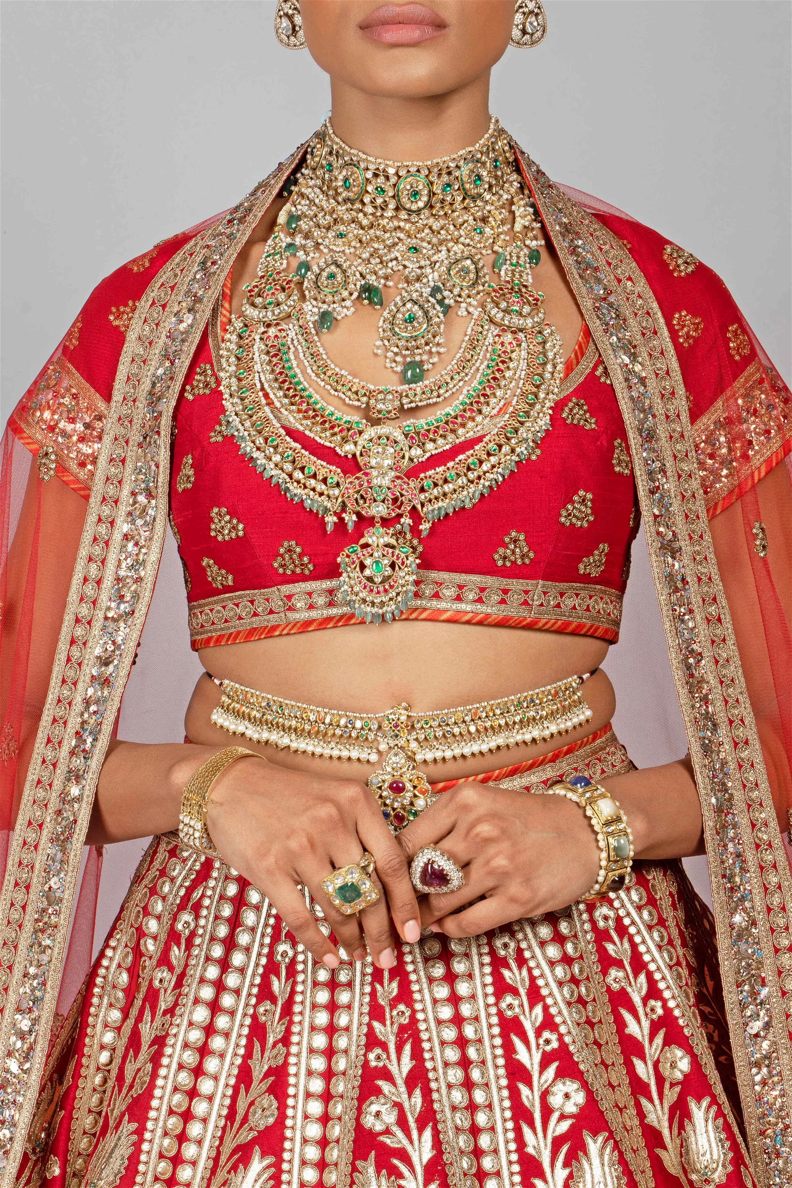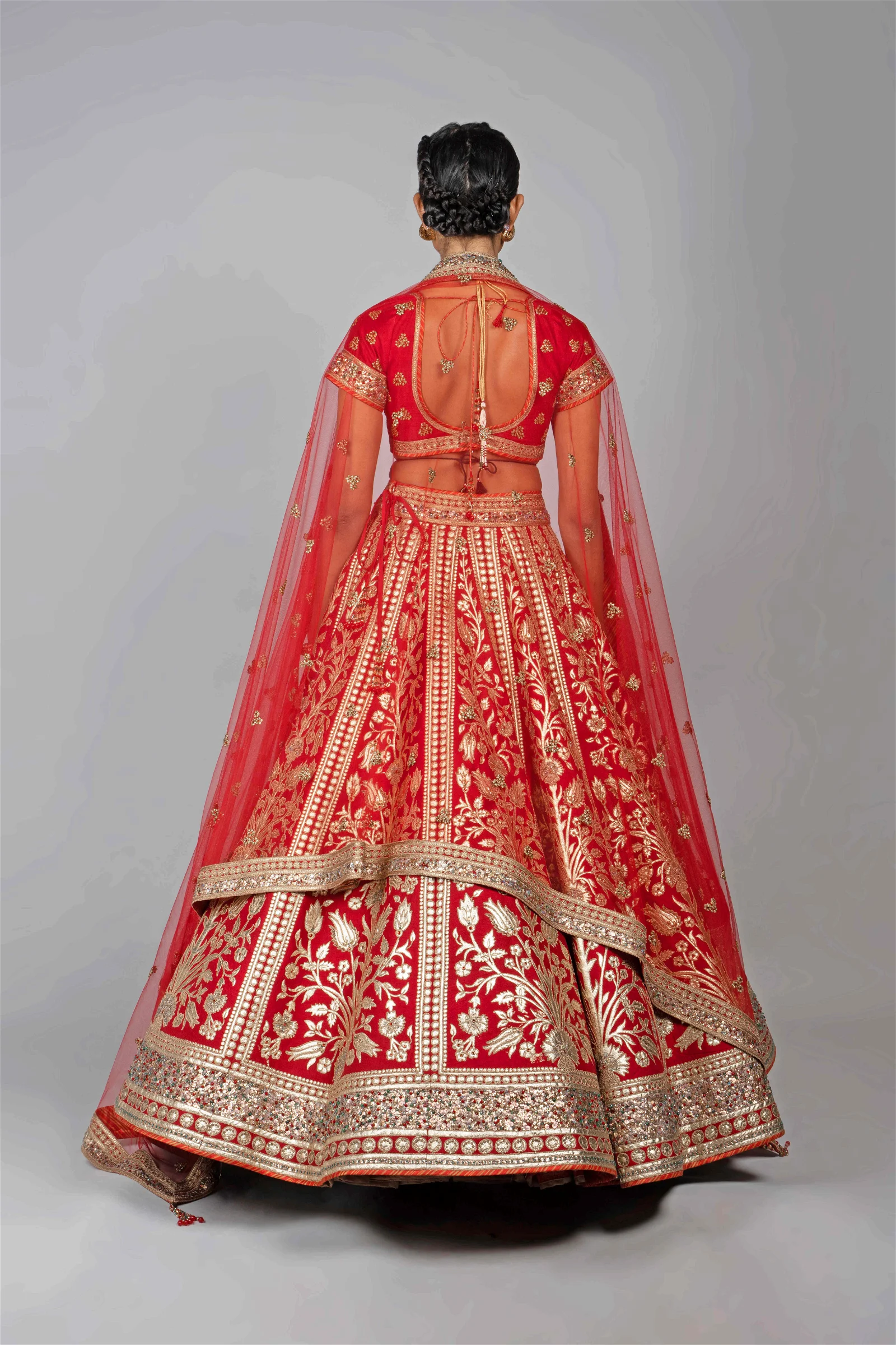 Red Raw Silk Embroidered Lehenga With Foiling And Red Raw Silk Embroidered Blouse Along With Red Tulle Embroidered Stole