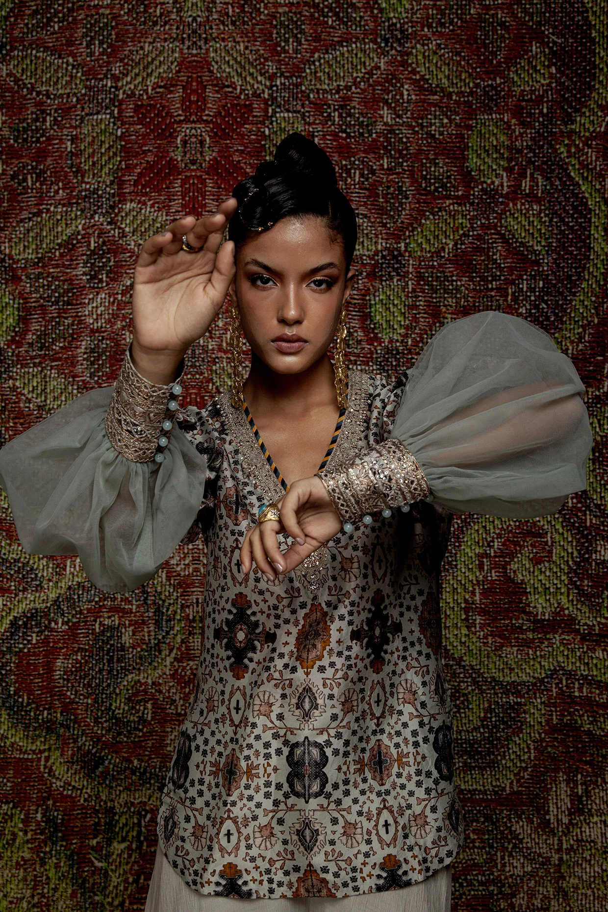 Printed Short Kurti With Signature Valaya Puff Sleeve And Jewel Neckline Embroidery Paired With A Matching Sharara