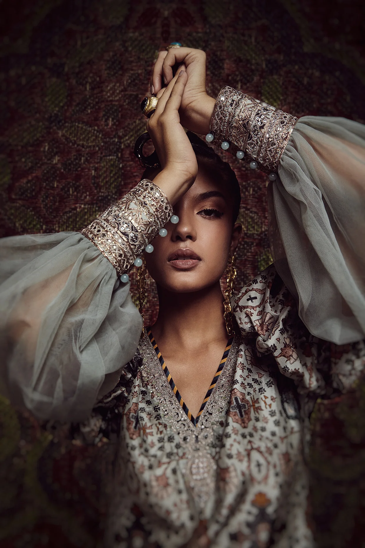 The philosophy of JJ Valaya is to create for today, not for tomorrow. JJ Valaya has been hugely motivated by history and wants to make it relevant today. Customers have access to the finest in the world today. JJ Valaya offers a mix of royalty and elegance. JJ Valaya's pieces showcase appreciation of history and find great magic in exploring the mysteries of various cultures to create something new. JJ Valaya believes Indian fashion houses must take the responsibility to nurture crafts and artisans. The designer is fascinated by beads, metals, buttons, gemstones, and sequins. As per the designer, embroidery is a medium that lends itself to anything that the mind can perceive. The use of metal embroidery is common in the designer's work. The presence of materials like dabka, kora, and mukaish is spotted in his designs in a contemporary way. JJ Valaya believes in experimenting with the medium without compromising on the purity of the technique.