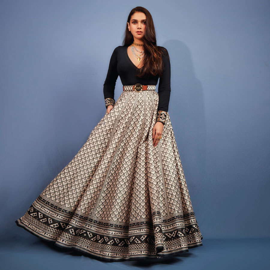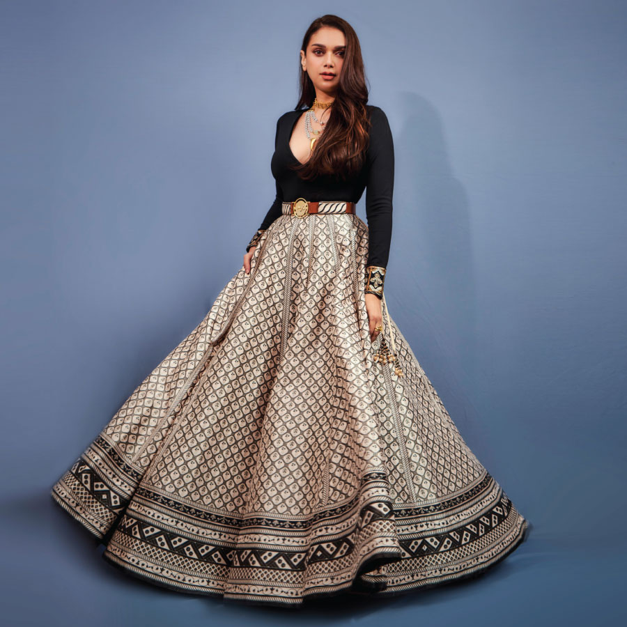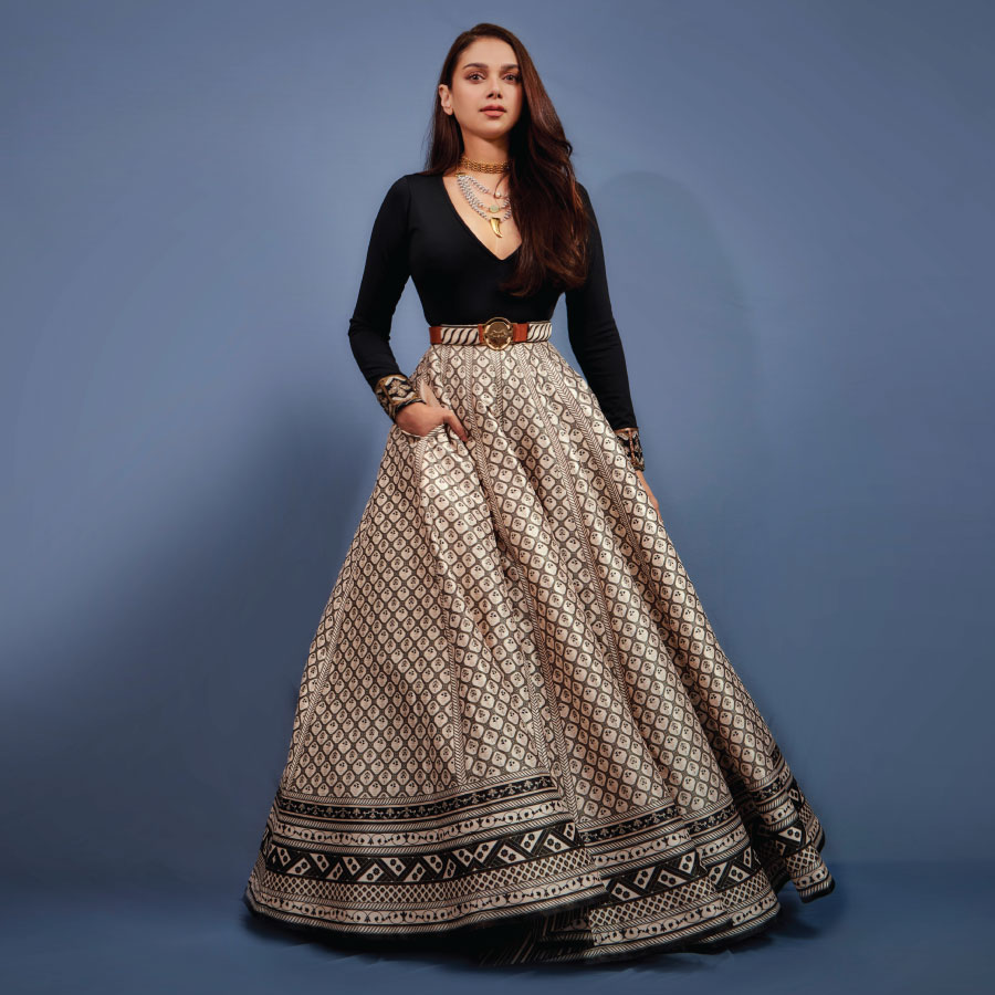 Aditi Rao Hydari shines as the muse for JJ Valaya for an event. She graces the occasion in a captivating ensemble that leaves everyone in awe. The ensemble includes a bodycon top with a plunging neckline and full sleeves with embroidered borders and a long printed skirt featuring the intricate patterns of Art Deco, paired with JJ Valaya’s signature tan leather belt with the phoenix buckle.