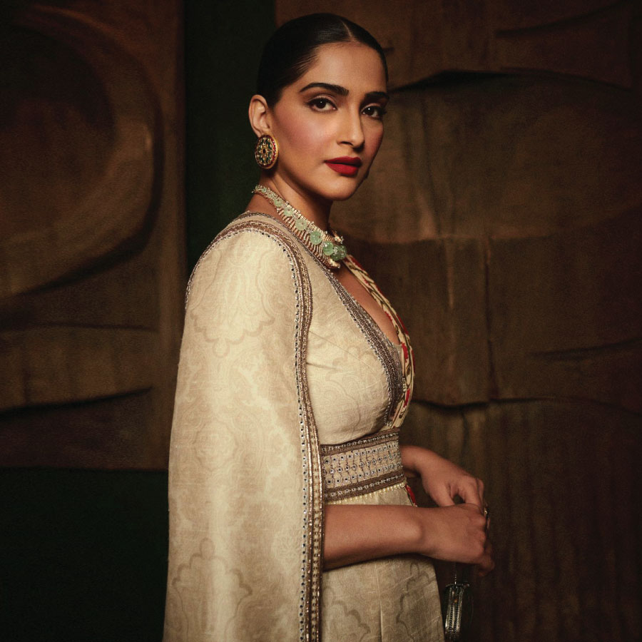 Actress Sonam Kapoor exudes elegance and redefines ethnic glamour in a stunning ensemble designed by JJ Valaya. The ensemble includes a printed saree delicately layered beneath an embroidered silk jacket, meticulously crafted exclusively for her. Enhancing her waistline is an embroidered kamar bandh, adding a touch of regal allure to her overall look. Sonam Kapoor expertly selects statement earrings and a necklace as her accessories, perfectly complementing the ensemble’s grandeur.