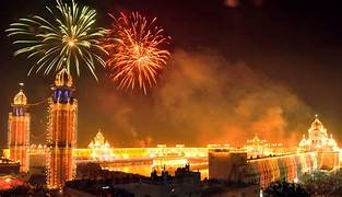 | During the festival, the celebrants illuminate their homes, temples and workspaces with diyas , candles and lanterns.[9] Hindus, in particular, have a ritual oil bath at dawn on each day of the festival. Diwali is also marked with fireworks and the decoration of floors with rangoli designs, and other parts of the house with jhalars. Food is a major focus with families partaking in feasts and sharing mithai.The festival is an annual homecoming and bonding period not only for families, but also for communities and associations, particularly those in urban areas, which will organise activities, events and gatherings. Many towns organise community parades and fairs with parades or music and dance performances in parks. Some Hindus, Jains and Sikhs will send Diwali greeting cards to family near and far during the festive season, occasionally with boxes of Indian confectionery.Another aspect of the festival is remembering the ancestors. | |||||||||