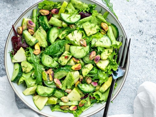This is simple yet so delicious green salad made with fresh mixed greens, soft avocado.