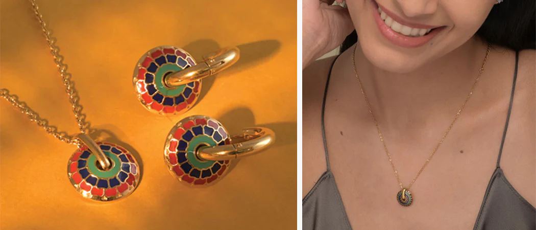 This gold jewellery set consists of a colour wheel flower necklace and a pair of earrings featuring the same colour wheel pendant. This gold jewellery design transcends the norms of conventional gold-plated jewellery with its minimalistic yet eccentric blend of gold tone plating and vibrant hues. Designed to cater to all occasions, its impeccable use of colours makes it a must-have, particularly for Holi.
